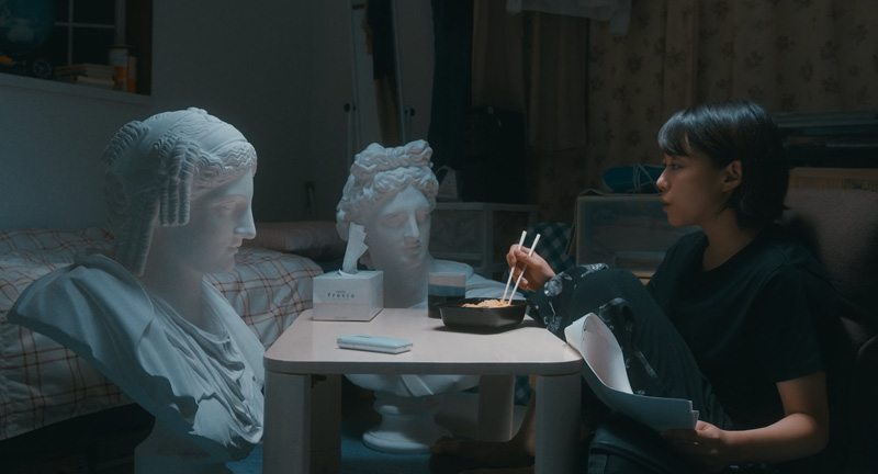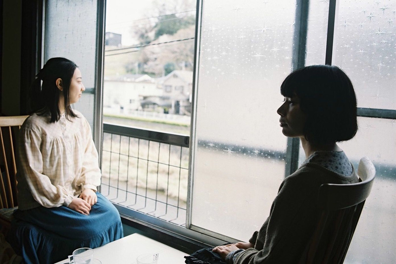 The source material, a Japanese tanka by poet Naoko Higashi, is translated as: “Gazing on / The stamp of address unknown / The recorder / Played by Haruhara-san.” In the film, there is indeed an envelope with an “address unknown” stamp, and a recorder, but we never learn who Haruhara-san is, nor how s/he might be related to the protagonist. Still, the accretion of mundane scenes, the long takes, the unusual encounters and the casual conversations over coffee or a meal remind us of the style of other arthouse films, and encourage us to put the pieces together.
